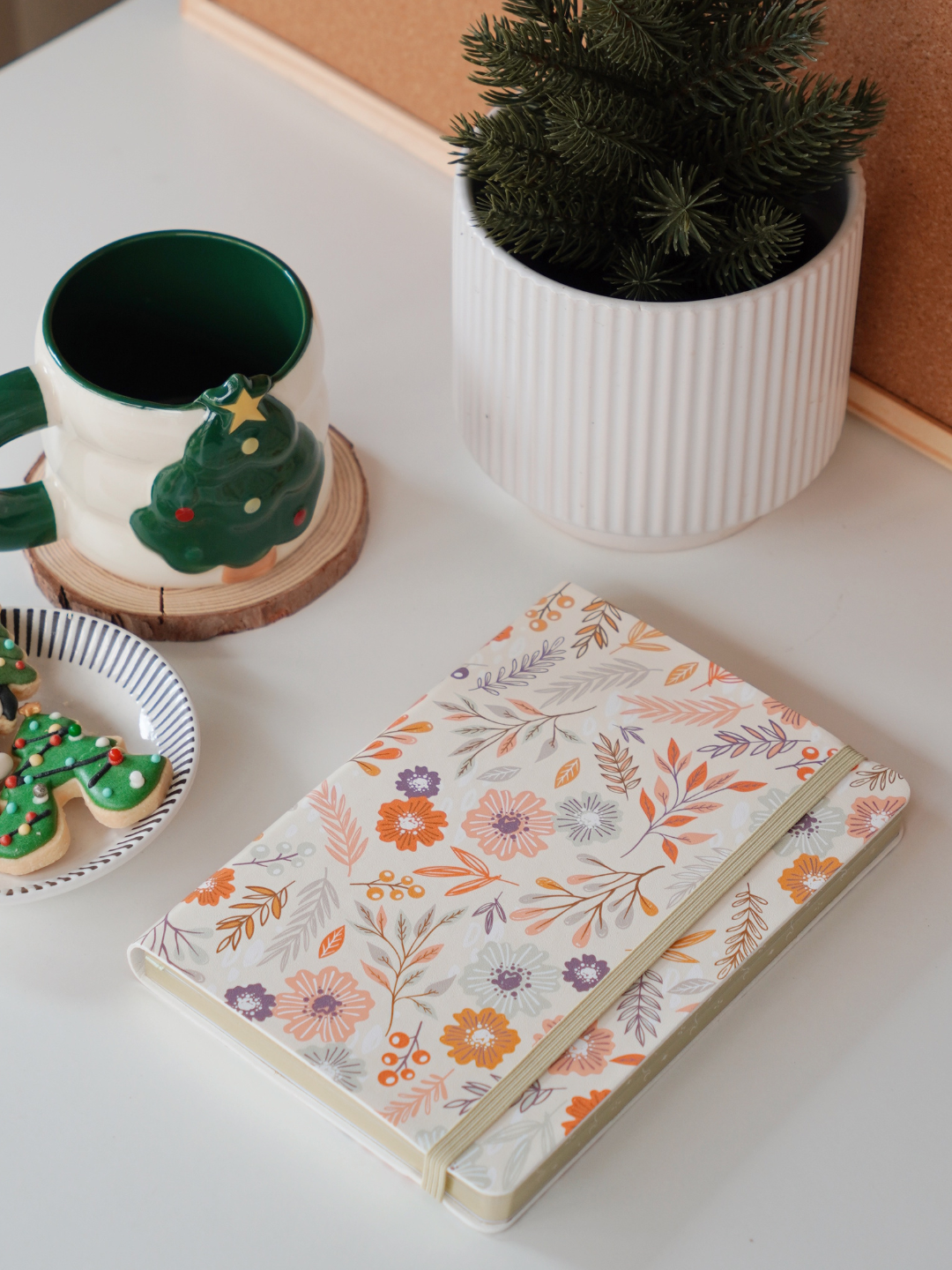 Embrace the beauty of fall with this stunning bullet journal, featuring a cover adorned with autumn-colored blooms and leaves. The rich, warm hues of orange, red, and gold evoke the cozy, vibrant spirit of the season, making it the perfect companion for capturing your thoughts, goals, and creative ideas.